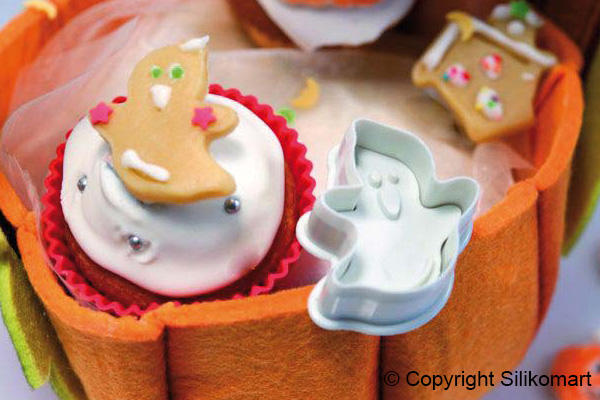set of 4 HALLOWEEN mini cutters with spring loaded plungers composed by: house, witch's hat, ghost, pumpkin.Size: 53x42 h 18 mm