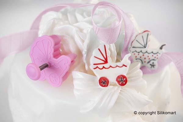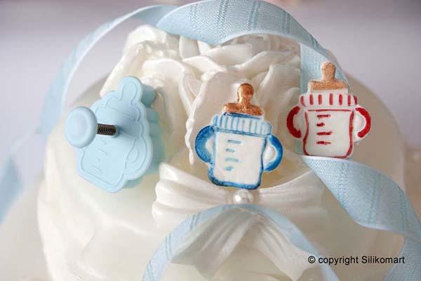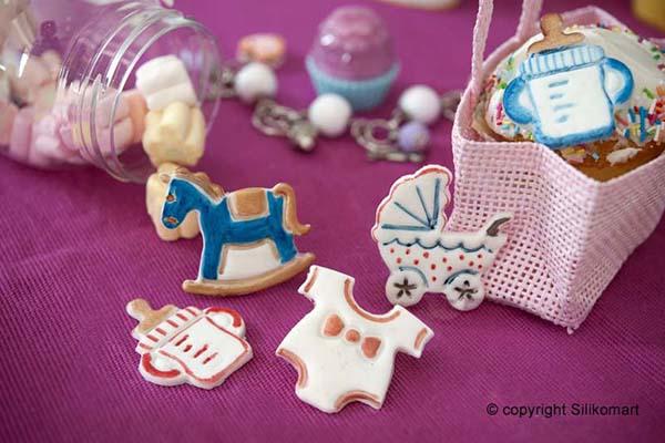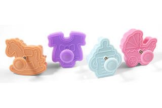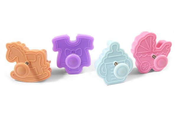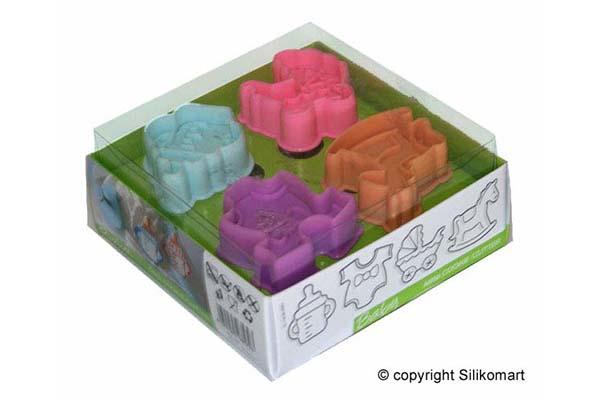 set of 4 BABY mini cutters with spring loaded plungers composed by: rocking horse, baby bib, baby bottle and baby carriage.Size: 48x45 mm x h 18 mm