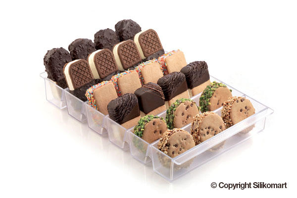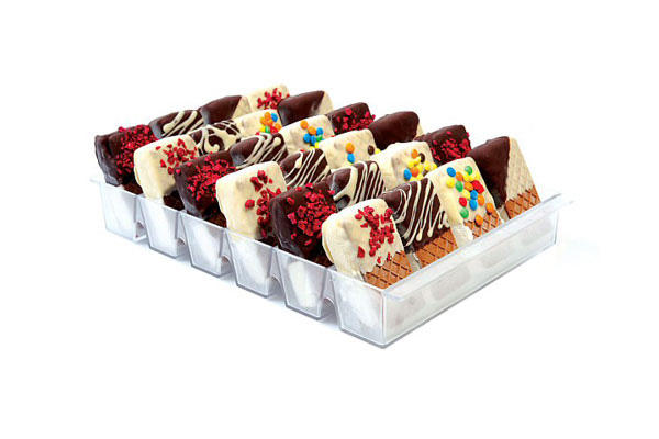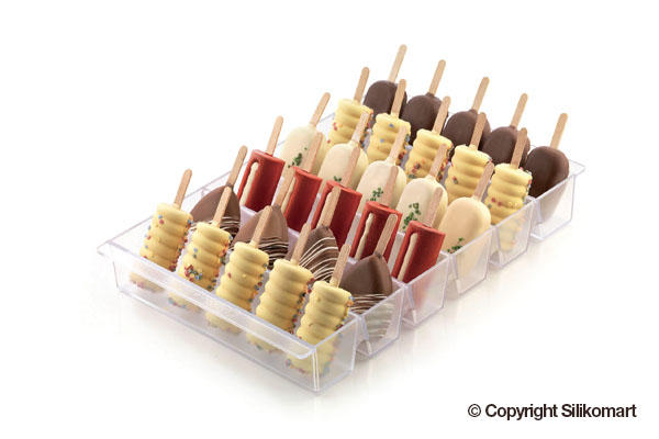 Espogel Down is the new and original ice cream display, made of polystyrene and available in 4 colours (transparent, orange, green and fuchsia), proposed by Silikomart Professional to present downwards ice creams on a stick and ice cream sandwiches. It takes the space of a standard ice-cream container and it is ideal for the whole Steccoflex, Steccoflex Mini, Cookieflex and Cookieflex Mini lines.