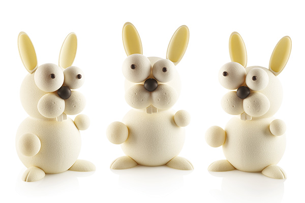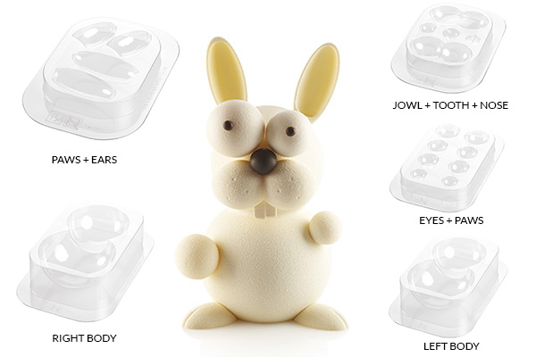 Kit composed of 5 thermoformed moulds created by Silikomart Professional designers in collaboration with the pastry and chocolate chef Raúl Bernal for the realisation of a 3D chocolate subject shaped like a bunny.