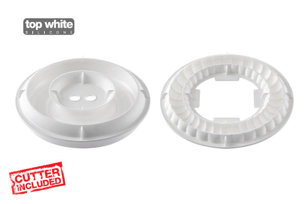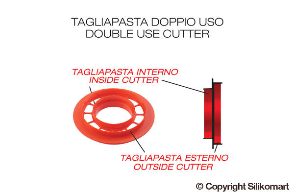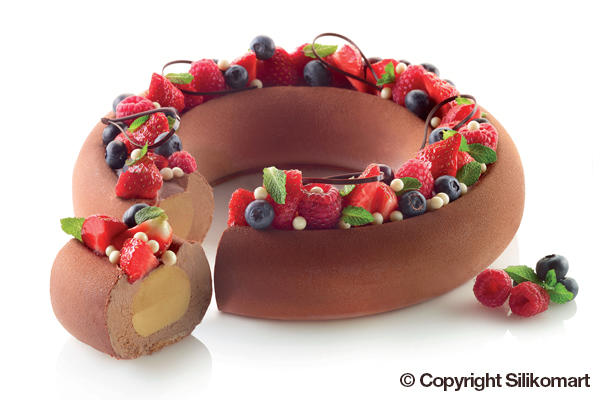 The Kit Symphony is composed by 3 elements: one silicone mould to make a preparation of 1443 ml/48,79 oz volume, one silicone insert to make a dessert with a unique effect when cut and one functioning plastic cutter to make original inserts or sponge cake and brittle bases.