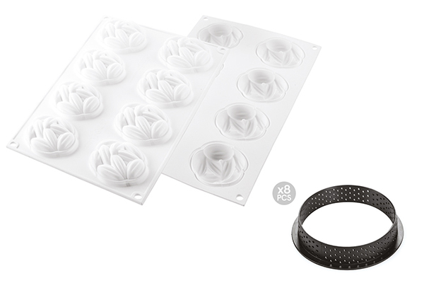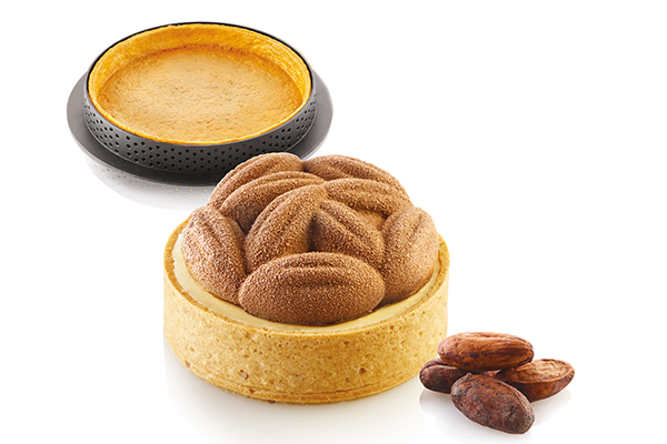 This brand new shape takes inspiration from the cocoa bean, the fruit that drives life in one of the most loved ingredients in the world: the chocolate. The Kit Tarte Ring Cocoa Ø 70 mm by Silikomart Professional is composed by two elements: 8 rings with a 70 mm diameter in thermoplastic composite crush-proof material suitable for baking and creating base and a silicone mould with 8 cavities of Ø 60 h 20 mm each to make some mousses or creams to lay over the shortcrusts. The rings are non-stick and stainless, they allow an homogenous baking and they are characterized by a high thermal stability.