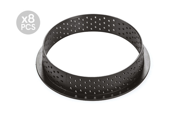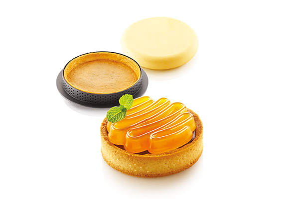 Soft and firm at the same time, the new Kit Tarte Ring Honoré Ø 80 mm by Silikomart Professional conceived with MOF Pâtissier Jean-Michel Perruchon will surprise you. The kit is composed by two elements: 8 rings with a 80 mm diameter in thermoplastic composite crush-proof material suitable for baking and creating the base and a silicone mould made up 8 cavities of Ø 70 h 13 mm each to make a mousse or a cream to lay over the shortcrust pastry. The rings are non-stick and stainless, they allow an homogenous baking and they are characterized by a high thermal stability.