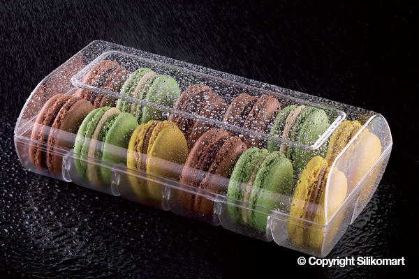 MACADO is a practical, resistant and functional plastic box for macarons. Available in 2 sizes: for 6 or for 12 macarons. It is composed by a transparent cover, and a tray available in 8 design colours. The cover can be closed hermetically with a stable joint. In this way macarons are protected from humidity. Furthermore, thanks to its transparency, the products inside are clearly visible. The bottom of MACADO is endowed with a structure that separate every single macaron so that they do not get damaged when displayed or carried. The box has been designed according to a modular size that allow to display exactly 10 MACADO for 12 macarons and 20 MACADO for 6 macarons on 60x40cm professional trays. MACADO can be customized with a sticker, a ribbon or any other decorative element used in pastry shops.
