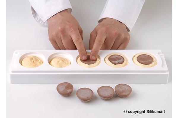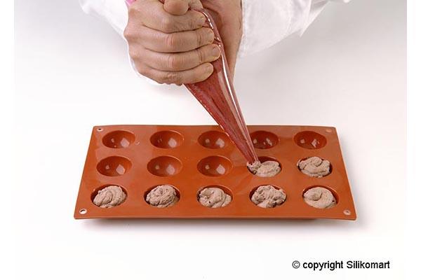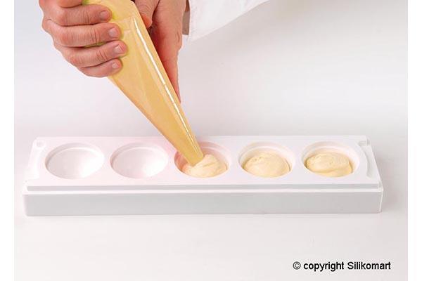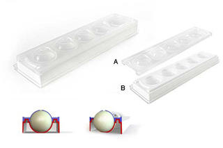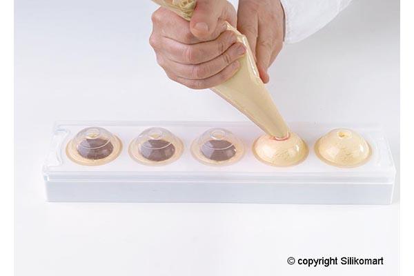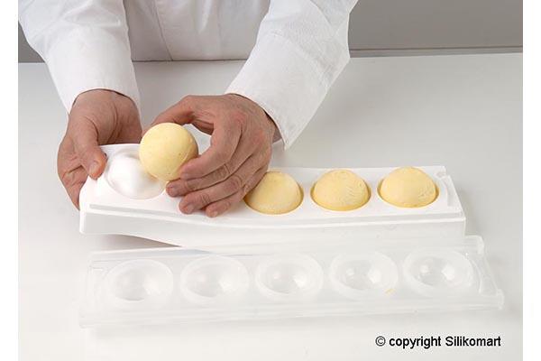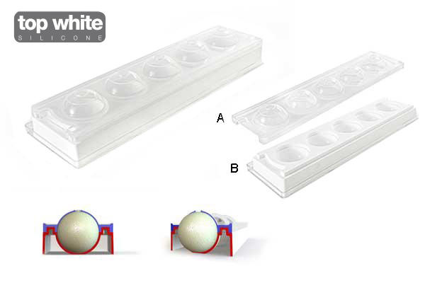 The evolution of Multiflex has resulted in theMUL3D, the silicone mould that enables you to prepare desserts and monoportions of spherical shape, The versatility of this mould allows to create surprising inserts and effects that make it really unique. Set A&.B +transparent tray (VGEL03) Size sphera: Ø 58 mm Volume sphera: 102x5=510 ml Tray:12x40 cm Advantages:Non-stick, easy to unmouldTransparency that allows to recognize the product insideStability of the sphere in the dish, thanks to the flat top of the mouldEasy to blast freezeCostumizable with Siliconflex inserts.