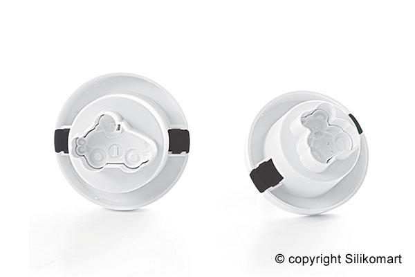 A set of two ejector cutters for pastry without metal parts. Itallowsyou to create 3D designs in one operation. The pastry cutterallows youto impress directly on the rolled out pastry and it can beused withsugar paste, short pastry, marzipan and chocolate paste.size:Big Ø35mm Small Ø25mm