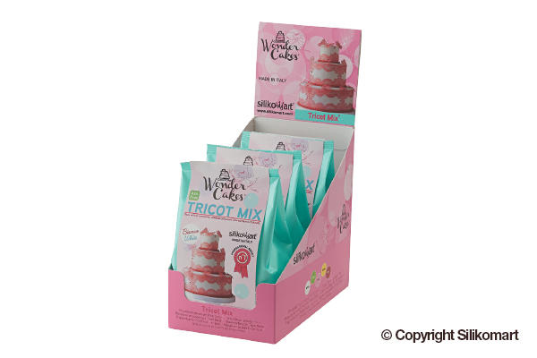 This powder mix, used with the Tricot Décor® Mats, is a great instrument for the realization of the most fine and detailed sugar laces. Tricot Mix allows you to decorate wedding cakes, cup cakes and a big variety of cookies to serve to your guests. The mix is available in 5 colours (white, yellow, pink, red, and green): once you’ve followed the instructions indicated on the package, you will obtain in few minutes a perfectly-shaped cake. For a real cake designer result! Size: 300g